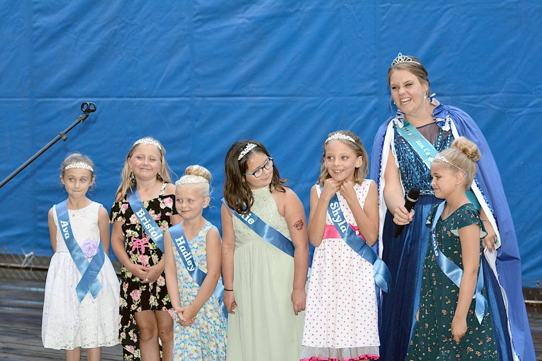 McKenna Mitchell, 2018 Hamilton County Fair Queen, interviews Zoie MacRunnel, one of the Little Misses at the fair queen coronation held Thursday. Other Misses include, from the left, Ava Henely, Bristol Ferrie, Hadley MacRunnel, Katie Egeland and Shyla Tapper.