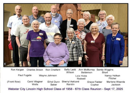 The Class of 1958 Lincoln High School, Webster City, enjoyed its 67th class reunion at the new shelter house West Twin Park on Wednesday, September 17. They enjoyed reconnecting with class mates, having a tour of Webster Theater, and plenty of pizza and salads for all. On September 18, the class met in St. Thomas foyer. Each classmate talked about what they have done the last 67 years; then they agreed to have a 68th reunion in September of 2026.