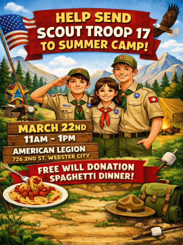 - Troop 17 Scouts will have a spaghetti dinner at the American Legion from 11 a.m. to 1 p.m. on March 22 for spaghetti, garlic bread and homemade desserts. For more information about the Scout program, or to learn more about sending them to camp, contact Scout Master Bill Baldwin at 515-297-3930 or Scout Recruiter Heather Hansen at 712-330-7159.