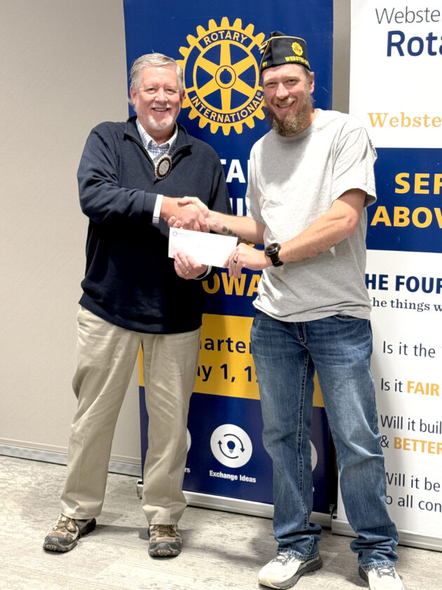 Kyle Swon, left, presents a check to Commander Matt McRunnel, of the American Legion Post 191, at the Rotary meeting Monday night. The Evening Rotary Club of Webster City presented a $600 donation to American Legion Post 191 during their meeting Monday. The Evening Rotary meeting was held at the Briggs Woods Conference Center, and the donation was made to help support local students attending Boys State and to assist the American Legion in their ongoing work. Boys State is a leadership program that provides high school students with hands-on experience in government, civic engagement, and leadership development. The contribution from Rotary helps ensure that area students have the opportunity to participate in this impactful program while also supporting the mission of the American Legion.