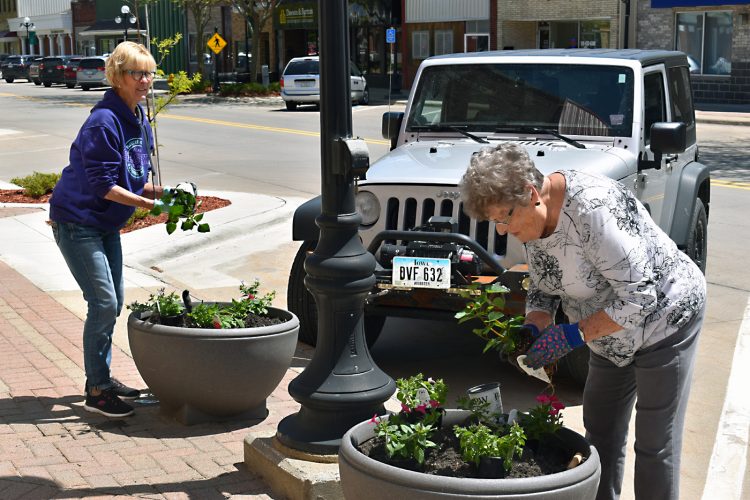 Jann Anderson and Joan Nessa fill planters Wednesday afternoon in downtown Webster City. The Town and Country Garden Club was out in force to spruce up the downtown.