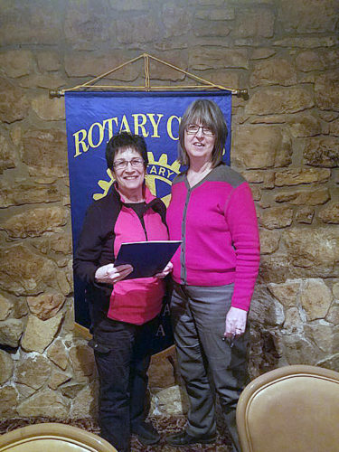 Webster City Rotary Club welcomed a new member at a recent meeting. President Kathy Getting, right, presents Paula Brownell with her membership materials.