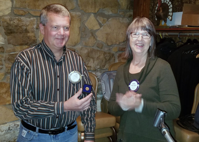 Joel Peterson was presented with a pin Monday representing his achieving the Paul Harris Fellow honor at Monday’s Webster City Rotary Club meeting. President Kathy Getting presented the award to Peterson.