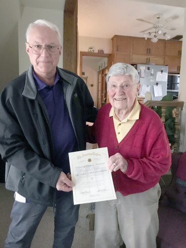 Dr. Caryl Hollingshead, right, was recently honored for 70 years of membership in the American Legion. Above, he receives a certificate from Richard Stroner, commander, American Legion Post 191.