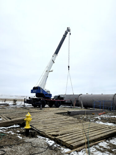 Large cylinders are laying near the beginning of a structure being erected, which will eventually be the newest water tower for Webster City.