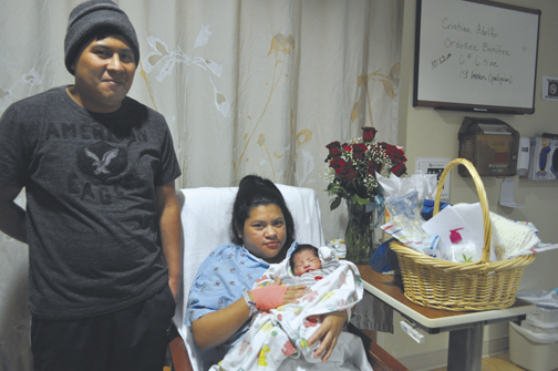 —Daily Freeman-Journal photo by Adri Sietstra Proud parents Paola Marta Benitez Reyes, 25, and Rudy A. Ordonez Lopez, 22, of Webster City, are pictured above with their son, Christian Adolfo Ordonez Benitez, who was the first baby born in 2017 at Van Diest Medical Center. He was born Tuesday, Jan. 3, 2017 at 10:12 a.m. Christian got an assortment of gifts from Van Diest Medical Center and other local businesses.