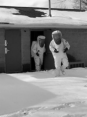 -Submitted photo Two members of the regional hazardous materials team walk out of the Duncombe water plant while working to control a chlorine leak there Wednesday afternoon. No evacuation was needed and no one was hurt during the incident.