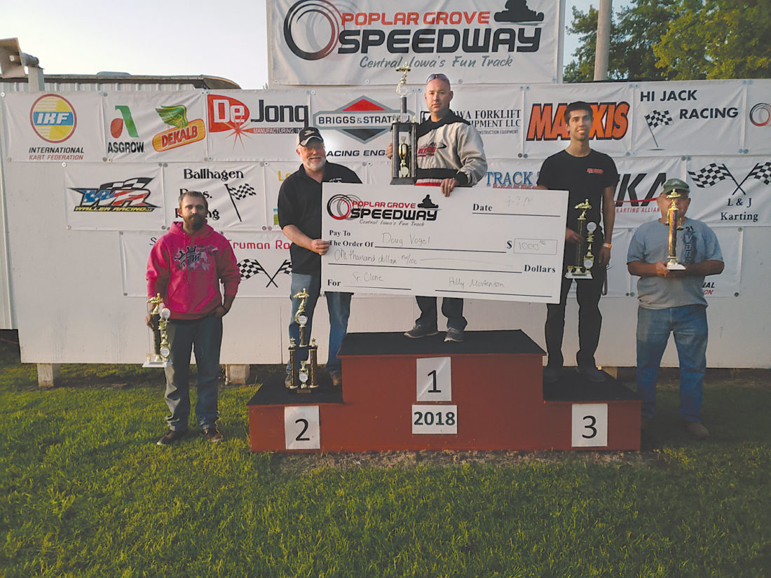 — Submitted photo In the 11th Annual Clone Nationals at Poplar Grove Speedway, Kamrar, held Sept. 9, the Senior Clone class paid $1,000 to win. Winners were, from the left, fifth place — Bryan Nevis, Des Moines; Tim Mortenson of Poplar Grove Speedway presenting the check to first place winner Doug Vogel of Carroll; Third place — Jerod Ballhagen, Allison and Lynn Vogel accepting fourth place winner trophy for Eddie Brose of Mitchellville. Kyle Heitz of Sherrill, who placed second.