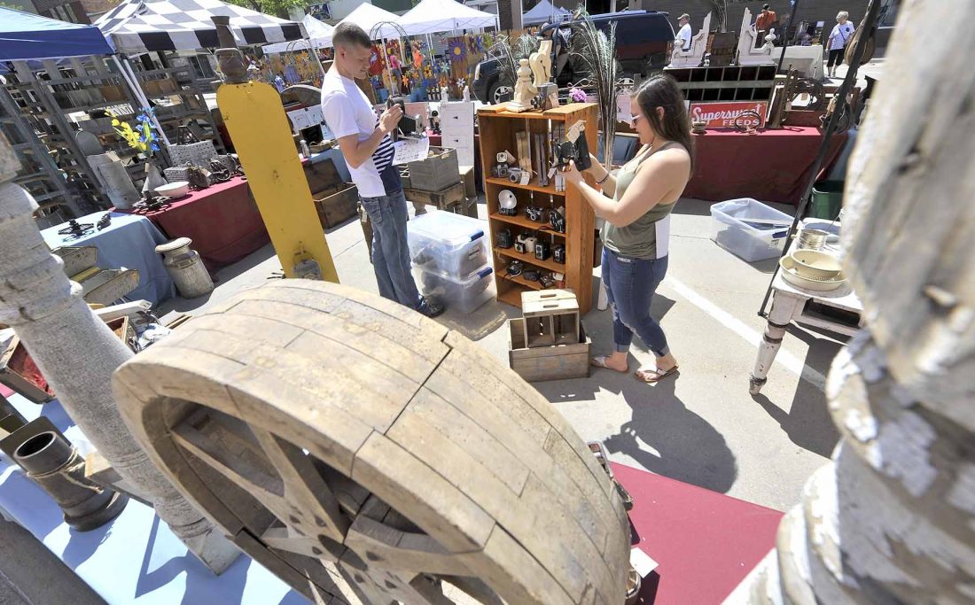 Jacob Naatz, at left, and Ashley Jochum, both of Fort Dodge, look over some of the old cameras for sale Friday afternoon at the 2018 JunqueFest in Webster City. The vendor they were visiting is The Pickin’ Preacher from Eldora.