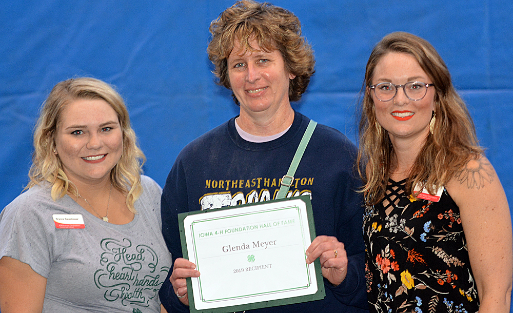 - Brynna Baumhover, left and Leah Feltz, right, presented Glenda Meyer with the Hamilton County 4-H Hall of Fame Award during the coronation ceremony Thursday night.