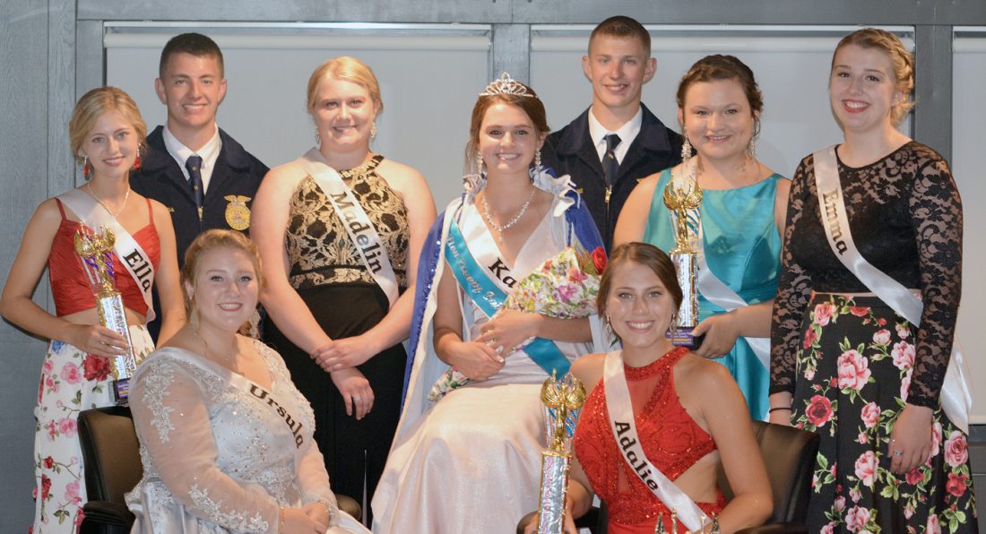 Members of the court are, seated, from the left, Ursula Leksell, Queen Katelyn Sogard and first runner-up and Miss Leadership Adalie Schwandt; second row, Ella Carlson, second runner-up; Madelin Egeland; Miss Congeniality Anna Utera-Greenfield, and Emma Bailey. Escorts were Brayden Evans, Quinton Grove and Jacob Hirsch