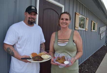 -Messenger photo by Chad Thompson Mike Glynn, left, and his wife Patti Glynn, owners of Copperhead Saloon & Restaurant, pose outside of the business with a sirloin steak meal and a side of Portabella mushrooms.