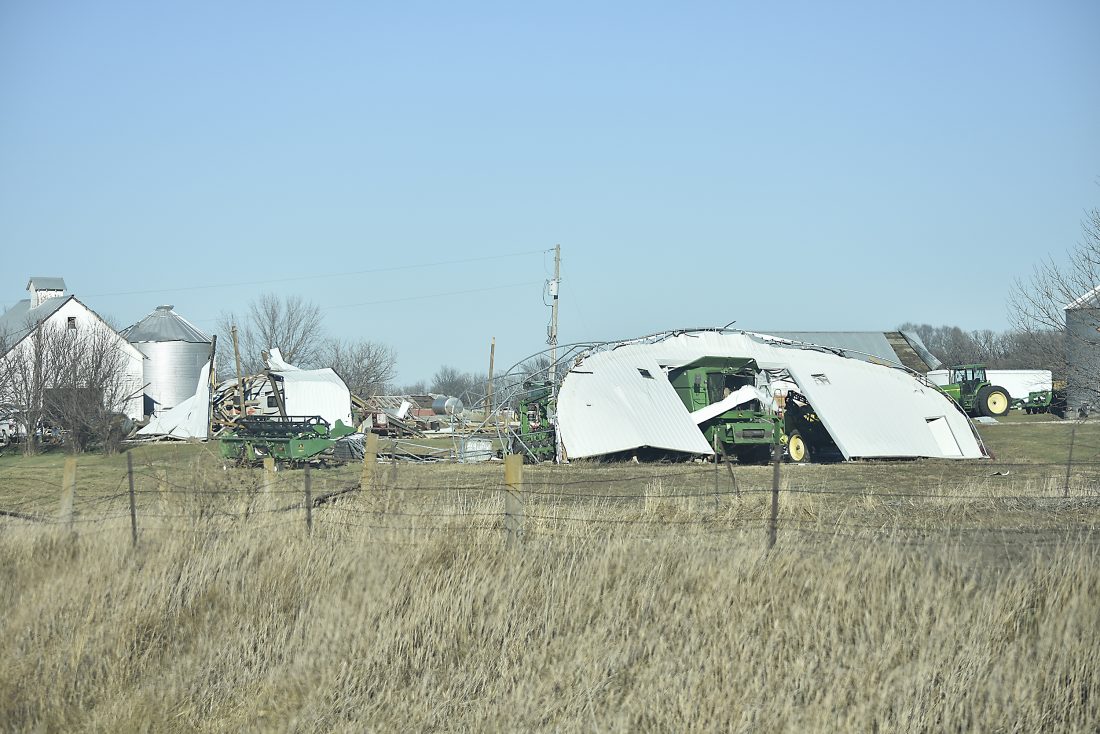 - -Daily Freeman-Journal photo by Kelby Wingert A machine shed was shredded and scattered around a farm in rural Hamilton County on Tunnel Mill Road near the Boone River during Wednesday’s storm.