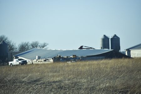 - -Daily Freeman-Journal photo by Kelby Wingert A building at a hog confinement in the 1400 block of 350th Street near Stratford had collapsed and sustained significant damage during Wednesday’s wind storm.