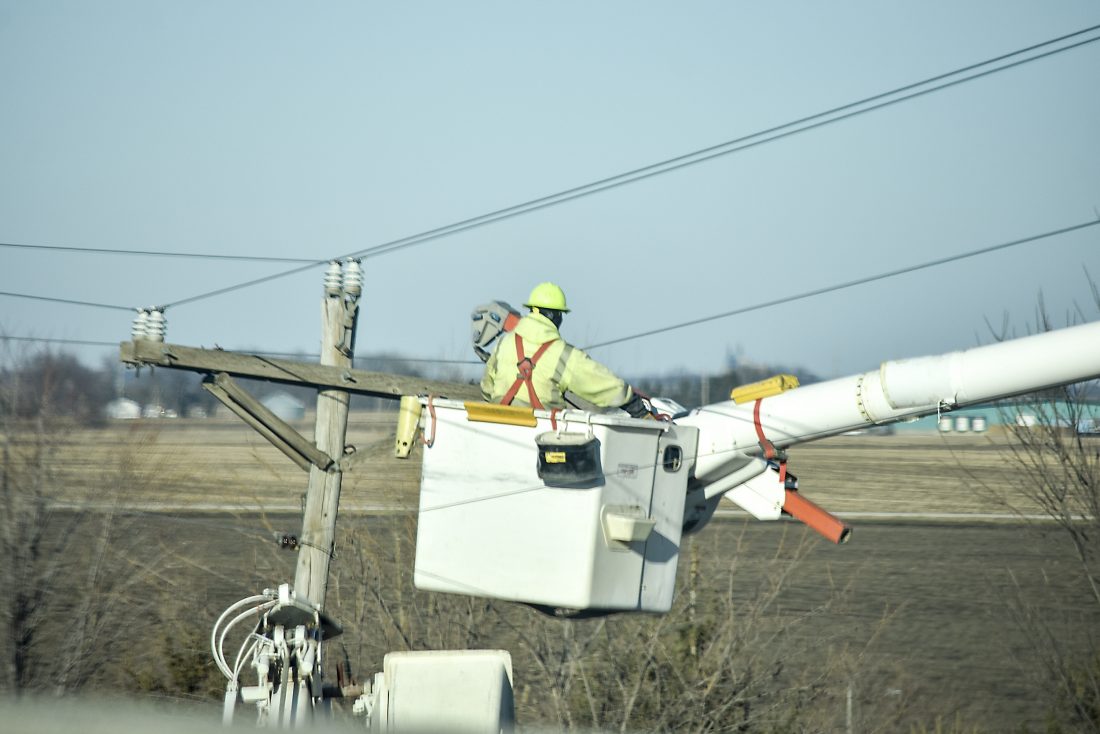 - -Daily Freeman-Journal photo by Kelby Wingert An electric worker with Prairie Energy Cooperative works on some damaged power lines near the overpass of Highway 17 and U.S. Highway 20 on Thursday afternoon.