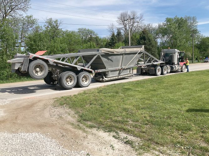 A truck pulling a belly dump trailer blocked traffic on White Fox Road Thursday afternoon when the trailer broke in half. The trailer was loaded with rock. Law enforcement closed White Fox to through traffic from Third Street to 210th Street at about 4:15 p.m. while responders dealt with the situation.