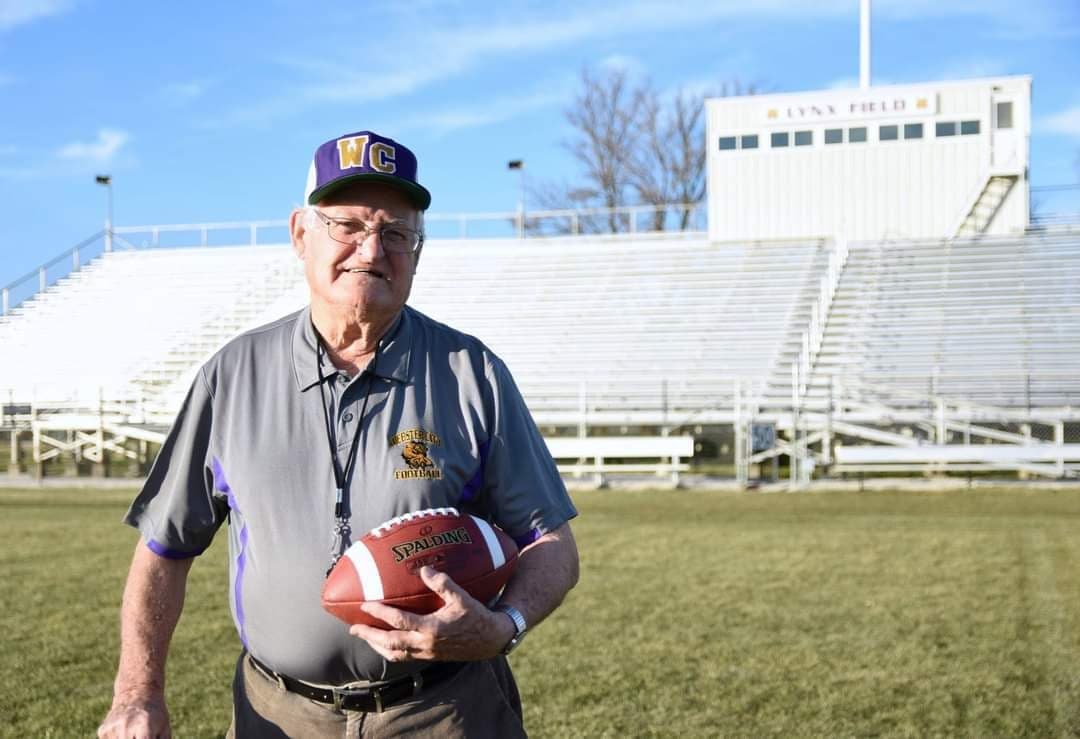 Retired Coach Dick Tighe, of Webster City, stands on the Lynx football field in 2017, right after he published his memoir, “Coach Tighe: 63 Years of High School Football.” He still tracks the local teams, and loves the beginning of football season.