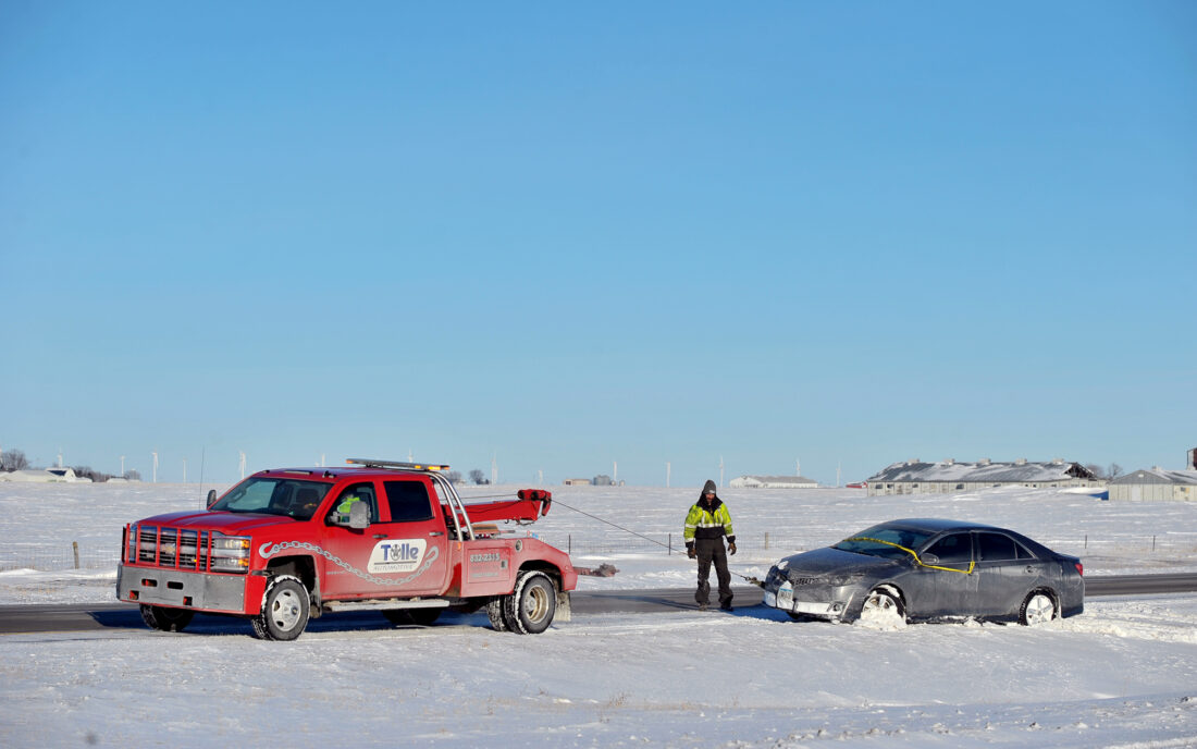 -Photo by Hans Madsen A crew from Tolle Automotive, of Webter City, work on pulling a car out of the median Monday afternoon just west of Highway 69 on westbound U.S. Highway 20. Overnight snow turned the road into a sheet of ice.