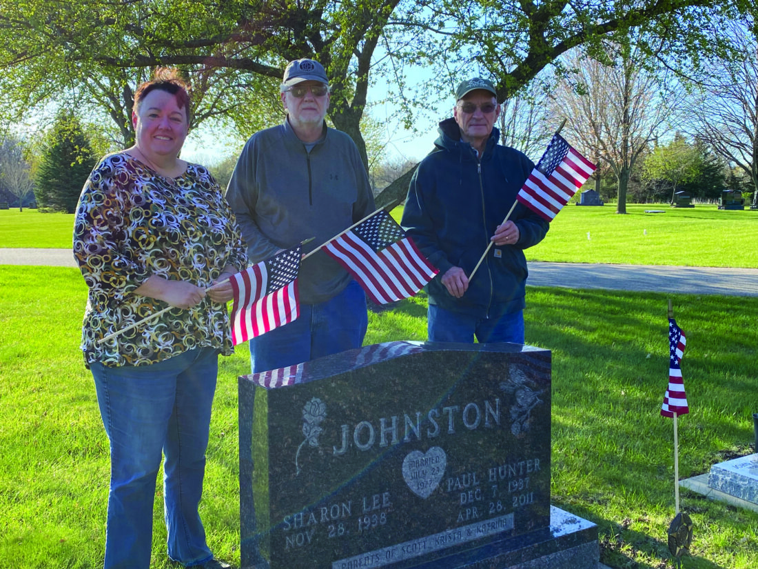 With Memorial Day and Flag Day approaching, Main Street, USA Kiwanis Club had recently chosen, for its 50th anniversary event for June, to donate 50 veteran flags to Graceland Cemetery in Webster City. Standing with flags at the gravesite of former Kiwanian and Vietnam veteran, Paul Johnston are (from left to right) Kiwanians Ann McLaughlin, John Boughton and Ron Keigan.