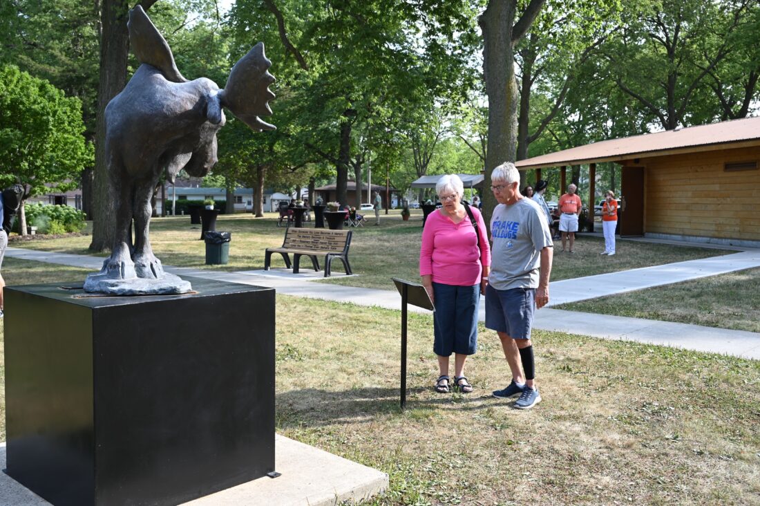 Lynn and Dan Corrow, of Webster City, read about Ralph Moose, the sculpture facing them, during Arts R Alive’s sculpture event Thursday at West Twin Park in Webster City.