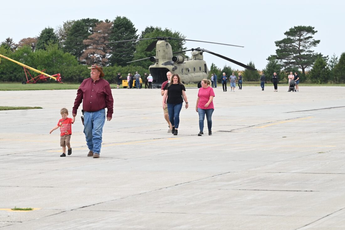 Visitors leave the CH-47 Chinook transport helicopter that was a centerpiece of the Fly-In Breakfast Sunday at the Webster City Municipal Airport. The event was hosted by American Legion Post 191.