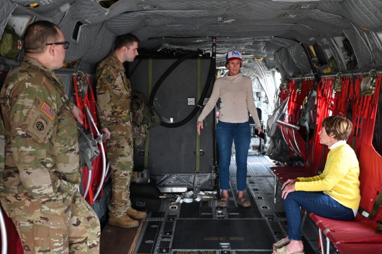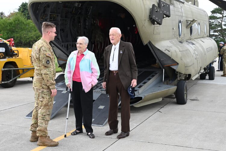 Chief Warrant Officer 3 Bradley Johnson, with Bravo Co. 1/171, out of Davenport, explains the Chinook to Deloris and Lee Ayers, of Webster City.