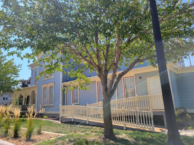 Recent upgrades to the house include newly painted exterior trim, a new roof, and fresh landscaping. Nancy Tjaden, Chad Eells and crew were up for the intricate task of removing, cleaning and replacing Plexiglass window covering, scraping and painting the front door, porches, ramp, corbels, dentil trim, gingerbread, and windows with the colonial blue, raspberry and cream color palette. That meant 41 windows, 260 poles and balusters, and a power lift to reach the highest gables.