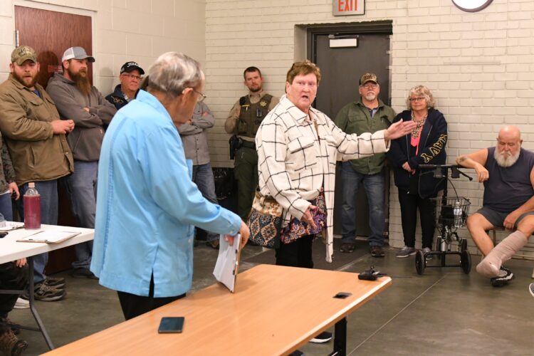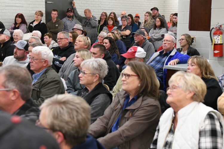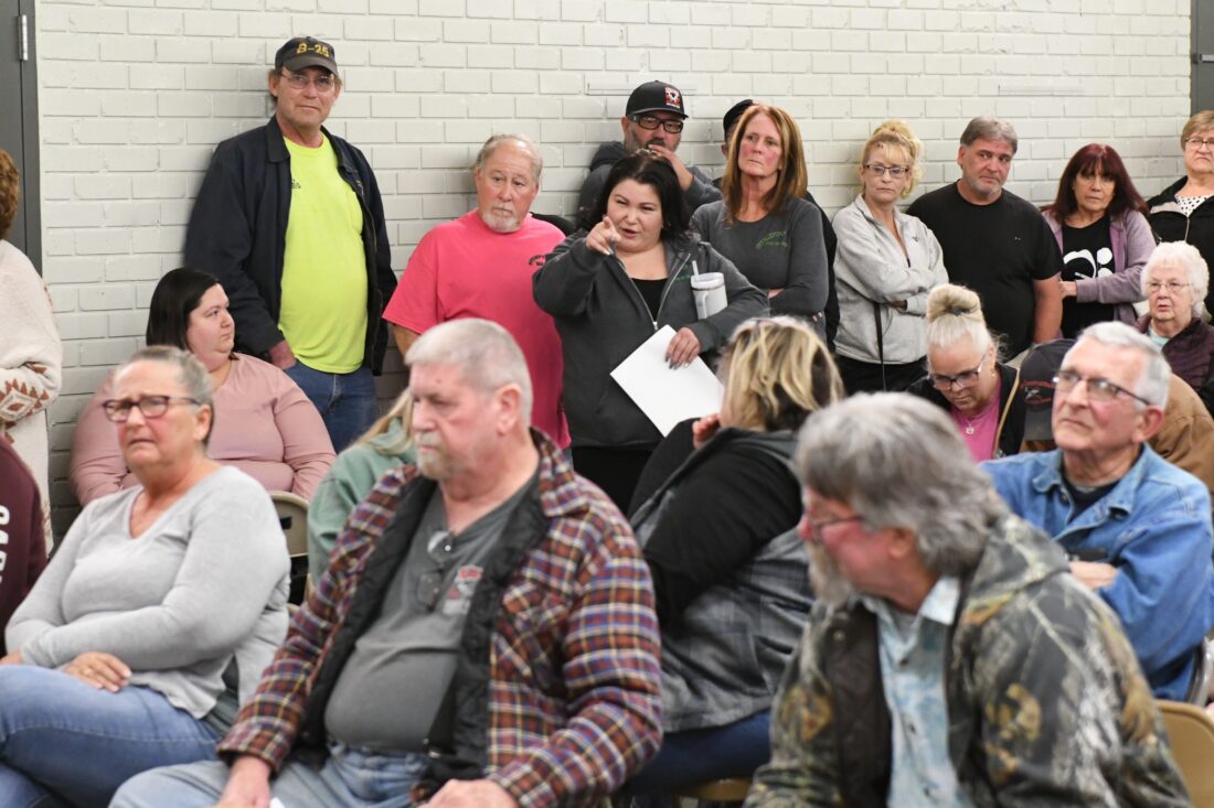 Connie Stuhrenber expresses her displeasure during the meeting in Duncombe Wednesday. Roger Snell, who moderated the meeting, listens.