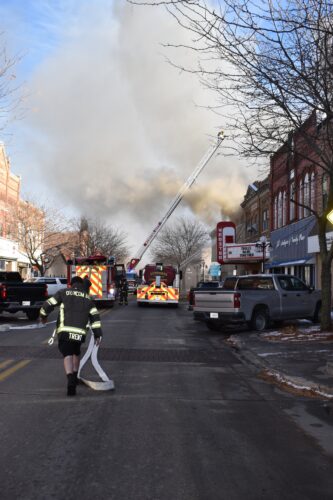 Multiple fire deparments prevented the fire in downtown Webster City Wednesday from destroying other structures. Daily Freeman-Journal photo/OHP Marketing Services
