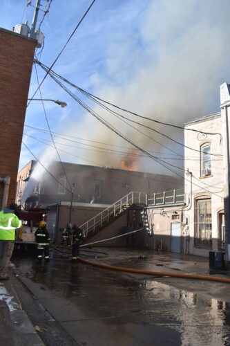 According to the building’s former owner, Gary Bettis, of Webster City, the fire’s origin appeared to be in the back apartment on the second floor of the building. Bettis said this as he stood at the entrance of the alley that runs behind his former building and watched as flames burst through the roof in that area.