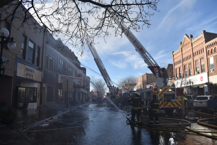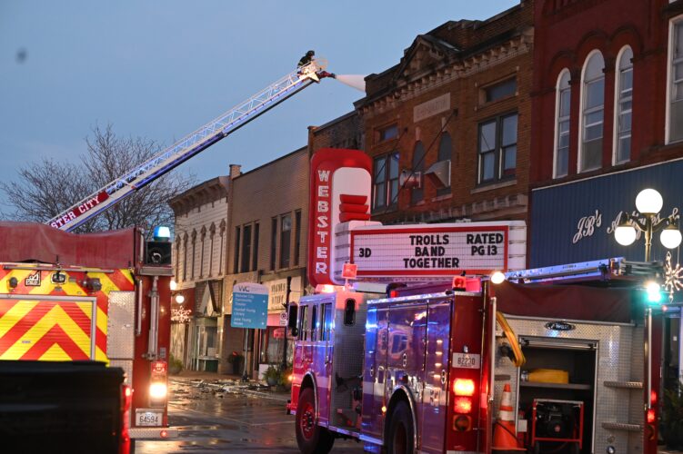 Ladder trucks from Webster City, Eagle Grove and Fort Dodge converged to keep the blaze at 608 Second St. from spreading to the historic Webster Theater next door.