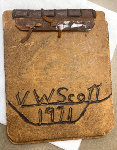 Scott constructed his book with materials from his jacket and the stalag windows. On the front cover, he carved his name and prison number.
