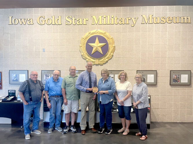 The Scott siblings donated their father’s book to the Gold Star Museum at Camp Dodge on June 28. Pictured are six of his eight siblings with Michael Vogt, curator. From left are Larry Scott, of Knoxville; Jim Scott, of Knoxville; Tom Scott, of Stanhope; Curator Michael Vogt; Becky Wibholm, of Blairsburg; Margaret Hoelscher, of Williams; and Cathy Olson, of Webster City.