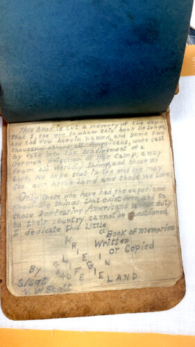 “This book is but a memory of the days that I, the one to whom this book belongs, and the few herein named, and some two thousand others, all Americans, were cast by fate into the confinement of a German Prisoner of War camp, away from all worldly things, and those we love. We hope that in the end we may see our homeland and those we love. Only those who have had the experience know the things that exist here, and to those God-fearing Americans whose duty to their country cannot be questioned, I dedicate this little ‘Book of Memories,’ written by S/Sgt. V.W. Scott.”