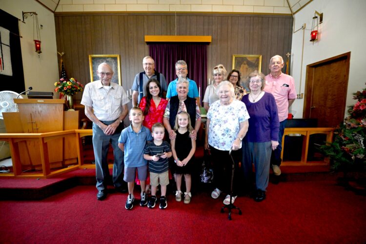 Everyone who attended the final service at Duncombe Methodist are pictured. In the back row, from left: Harold (Andy) Anderson, in the white shirt sleeve — he will be a 100 this year; Darrell Moenck, Jerry Clabaugh, Pat Nelson, Judy McCormick and Rick McCormick in the pink shirt. In the center row are Melody Haman, Barb Clabaugh, Evelyn Denclau, and Yvonne Paulson. In the front row are Ridge Haman, Stetson Haman and Londyn Haman.