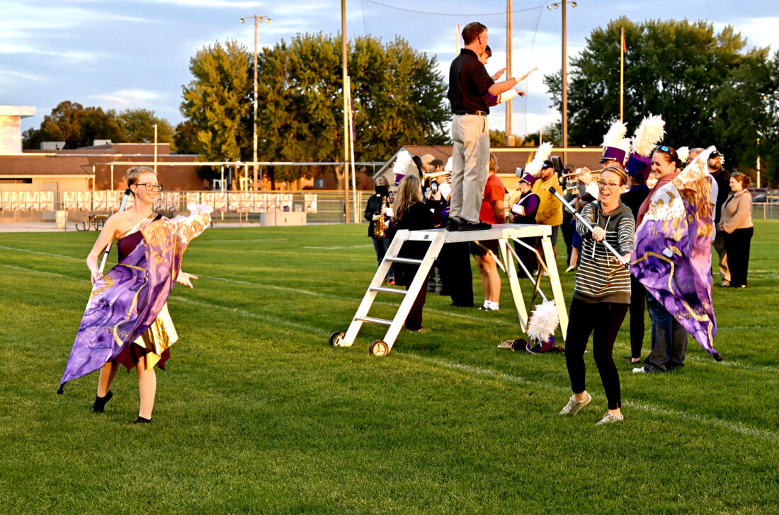 Brooklyn Neddermeyer, left, performs with the flags with her mother, Kristie Neddermeyer, right, during Monday night’s Lynx Imperials Band Showcase at Lynx Field. Family members were invited down to the field to join their students.