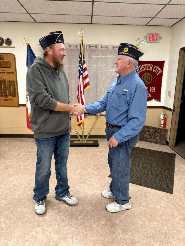 Matt MacRunnel was recently sworn in as vice commander of The Webster City American Legion Post 191 by Commander Dave Gordon. MacRunnel is pictured, left, being congratulated by Gordon.