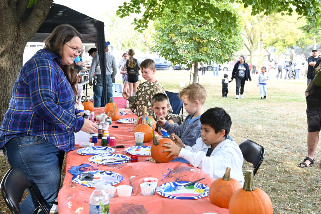 Robin Streigle, left, of the Webster City Area Chamber of Commerce, oversees pumpkin decorating at the first Fall Festival held in October 2024 at the Wilson Brewer Park. On the right of the table are from front to back are Bradley Ochoa of Clarion; Ryker Ingebritson of Clarion; Nathaniel Land of Webster City; and Kai Ingebritson of Clarion.