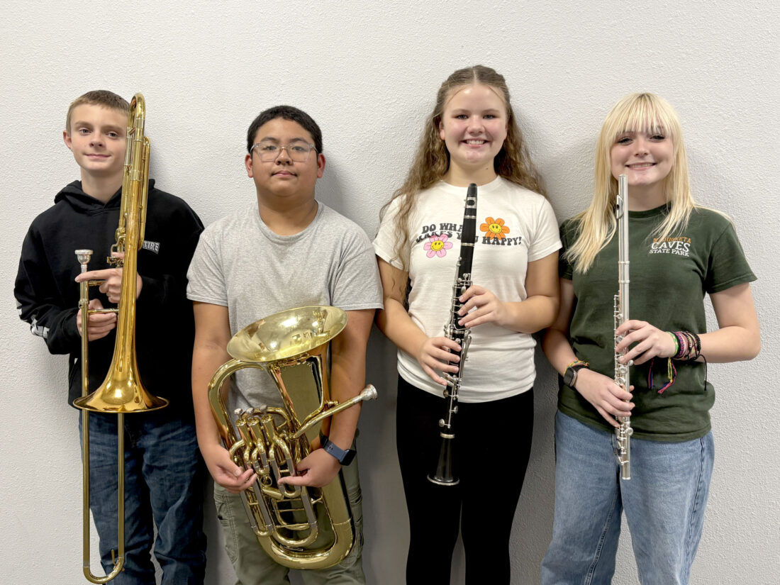 The Webster City Middle School Band students honored are, from left, Tanner Lenning, trombone; Henry Evan Romero, euphonium; Carsten Hrnicek, clarinet; and Lydia Propes, flute.