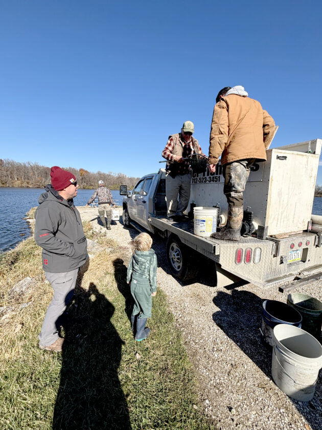 Jake Peterson and his son, Ozzie, watch Ryan Rupiper, Brian Holt, Larry Haren and an employee of Beemers Fisheries unload walleye into Briggs Woods Lake last week.