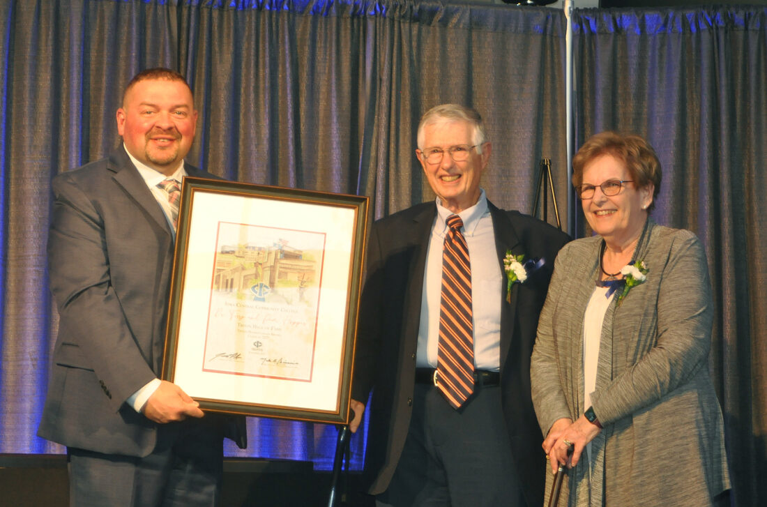 Jesse Ulrich, president of Iowa Central Community College, presents Dr. Terry and Pam Hopper with a certificate Saturday evening acknowledging their induction into the college’s Hall of Fame.