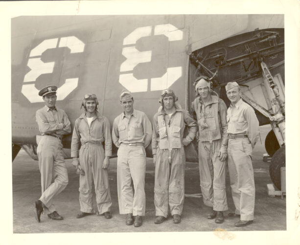 In a shot believed to be taken aboard the aircraft carrier USS Essex in March 1945, John Chambers, third from right, is dressed as he would have been in pilot’s gear. The men second from left and second from right, were in Chamber’s crew as bombadiers or gunners. The photo shows the folding wing of the Grumman Avenger. Such wings allowed many more planes to be assigned to carriers.