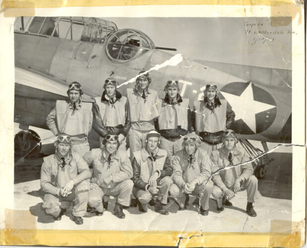 John Chambers, second from right in first row, is shown with his air artillery class during training at Naval Air Station Miami in Florida in January, 1943. Behind the men is a Grumman Avenger, the plane Chambers flew in 37 verified combat missions in the Pacific Theater.