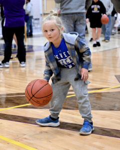 Tuf Pruismann, of Webster City, dribbles a basketball at the winter sports pep rally Thursday evening.