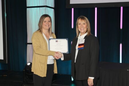 Jill Silver, left, is congratulated by Michele Russell, IHA Board chair. Silver graduated from the Iowa Hospital Association’s Leadership Development Program in October.