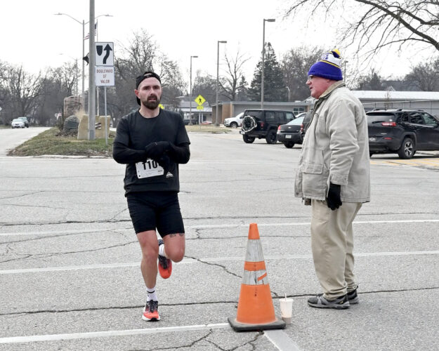 Devon Gurnett, of Des Moines, took first place in Thursday’s Thanksgiving Day Turkey Trot with a time of 17:49. He was greeted at the finish line by Mark Glascock, Webster City.