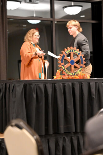 Rotarian Tiffany Larson presents WCHS honoree Aiden Hrnicek with his certificate.