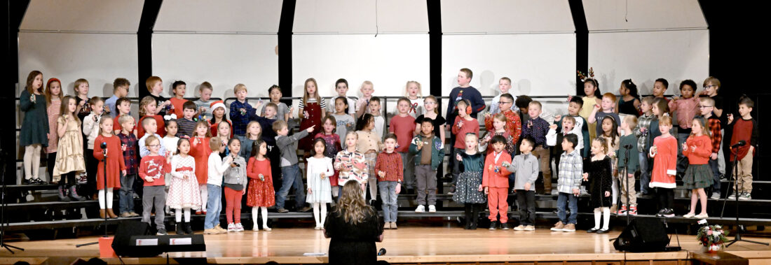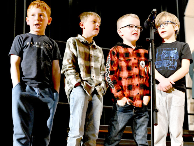 Five students sing at the microphone are, from left, Brinkley, Ridge, Ella, John and Khalil.