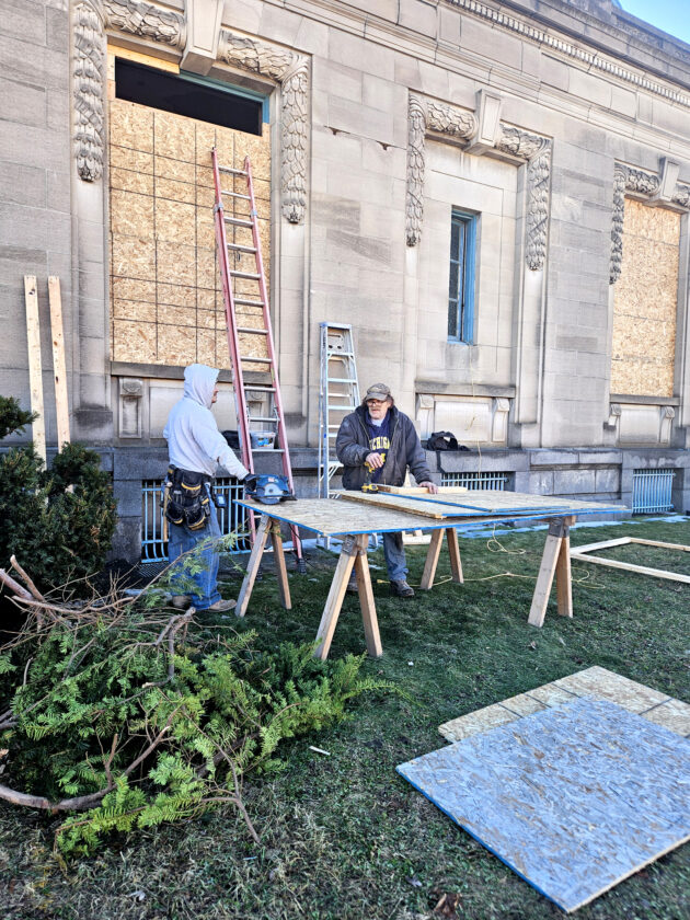 It was a beautiful day to work outside Wednesday, and the crew from Habhab Construction were enjoying the mild temperatures as they continued work to take out windows from the old post office, and secure the building. Working in the years are Hipolito, on the left and Dave Haggard on the right, part of the Habhab Construction team . Haggard explained that Interior work has been in progress during the winter months in addition to work on the windows.. The windows taken out of the building are being carefully restored, maintaining the integrity of the historic building.