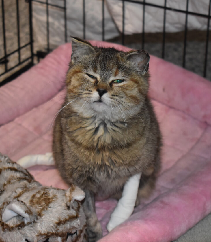 Milk Dud was lucky. She had a rescuer who was able to get her to the Webster City Veterinarian Clinic. For many cats this would have ended badly, for Milk Dud, she was able to get the care she needed.